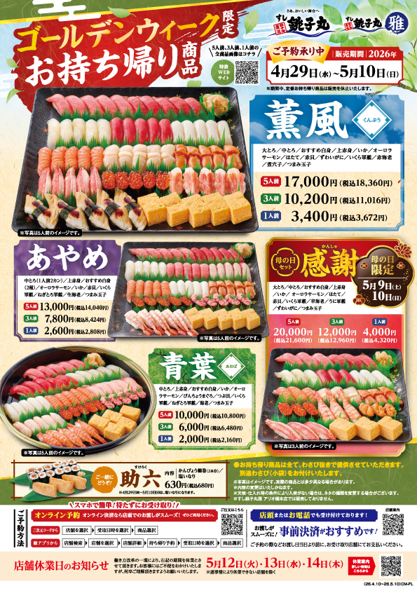 ● 働き方改革の一環として、年始ならびにゴールデンウイーク後に店休日を設ける場合がございます。適宜お知らせいたします。
